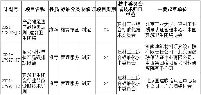 為發(fā)揮標準在推進工業(yè)領域碳達峰碳中和工作的引領和規(guī)范作用,工業(yè)和信息化部于2021年12月22日下達了工業(yè)領域首批110項碳達峰碳中和專項行業(yè)標準制修訂項目計劃,其中,陶瓷行業(yè)共有3項(見附表)。本批行業(yè)碳達峰碳中和專項行業(yè)標準重點圍繞碳核查核算、低碳技術與裝備、低碳產(chǎn)品與企業(yè)評價、監(jiān)測設備與方法、碳排放以及綠色低碳建材評價、資源綜合利用協(xié)同降碳等方面。