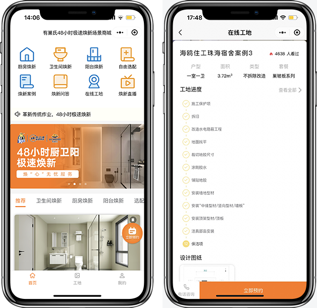 “48小時廚衛(wèi)陽極速煥新”小程序是家先生全新打造的官方廚衛(wèi)陽煥新服務體系。該體系集“廚房煥新”、“浴室煥新”和“陽臺煥新”、“自由選配”、“在線工地”等功能于一體,是一款煥新有保障、更快捷、個性化煥新需求的煥新服務體系。