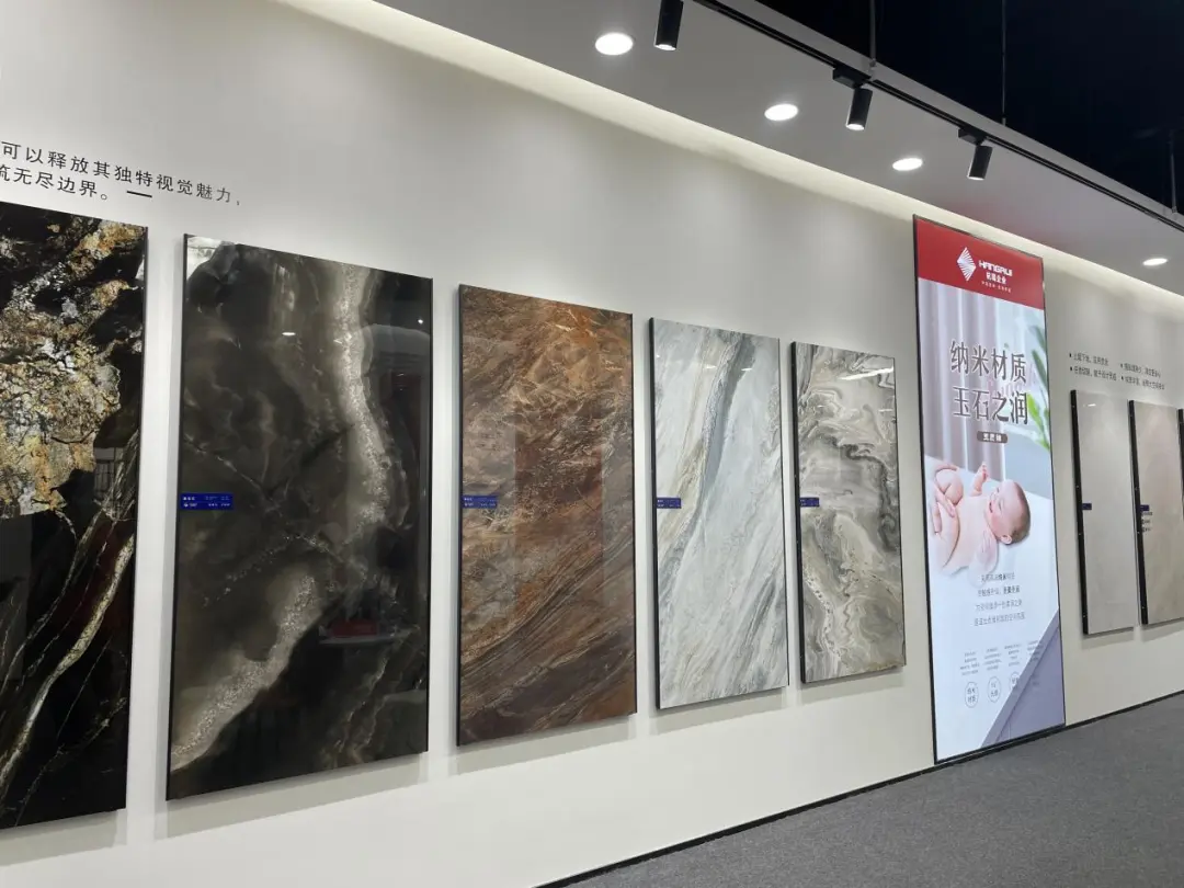 湖北杭瑞企業(yè)作為產(chǎn)區(qū)領(lǐng)軍企業(yè)、行業(yè)頭部企業(yè),全面展示了復(fù)刻釉、玉質(zhì)釉、數(shù)碼釉、1:1大理石、奢石匯、藝墅家系列、高光瓷片。其中,1:1復(fù)刻天然石材的紋理無(wú)限接近石材天然質(zhì)感,玉質(zhì)釉采用自主研發(fā)的高端納米材質(zhì)使觸感升級(jí)、更柔更潤(rùn),數(shù)碼釉還原自然真石的凹凸質(zhì)感。而300×300、300×600mm瓷片有亮光、啞光、純色、網(wǎng)紅對(duì)位格子磚,可承接高中低檔指定品牌工程定制產(chǎn)品。