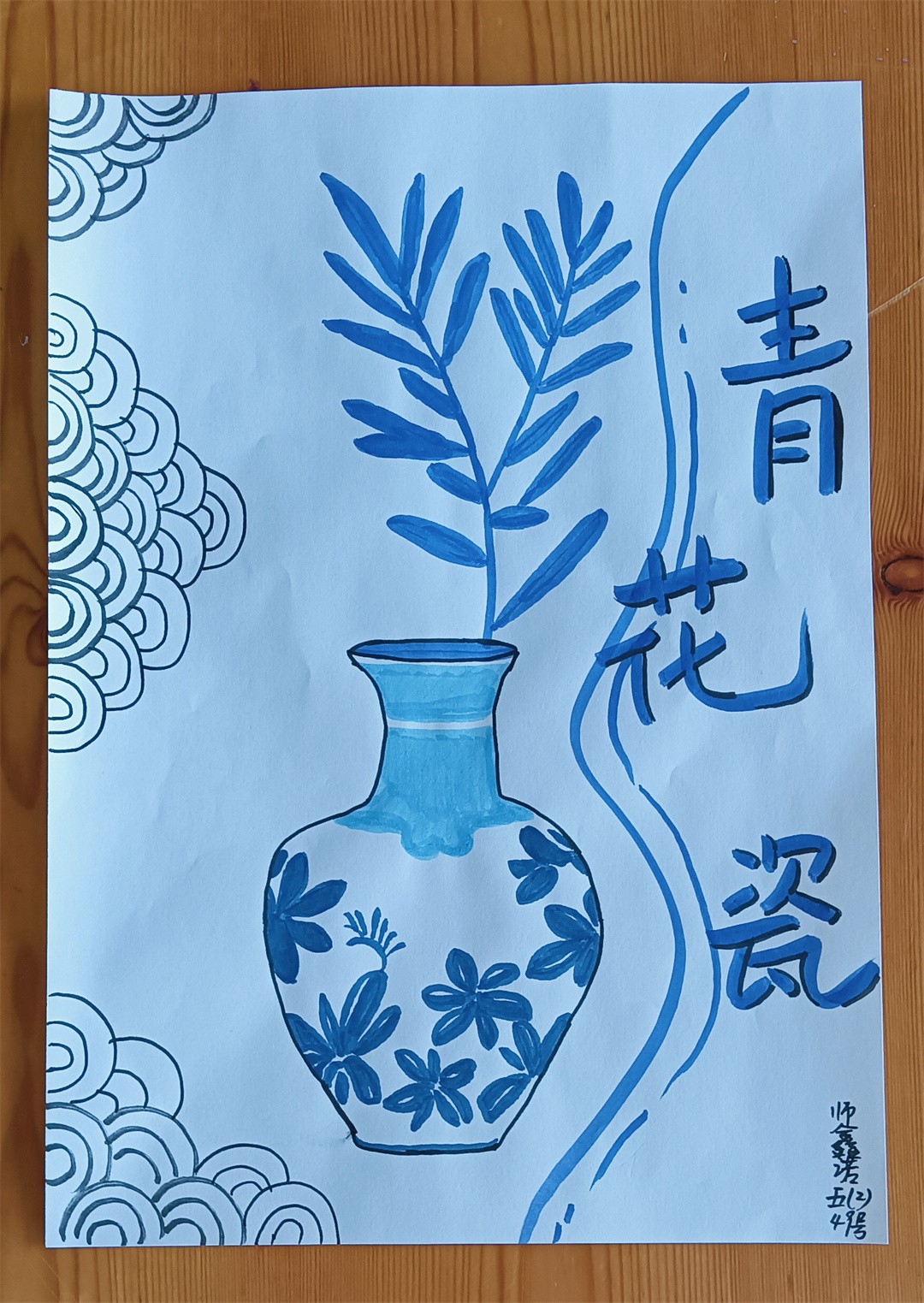 青花瓷線描,1、輪廓起稿,觀察青花瓷圖片資料,用鉛筆分出瓶口、瓶身、瓶底區(qū)域,注意線條方向,不是直線條。2、用鉛筆勾勒出花紋,注意用鉛筆時(shí),筆要輕。3、用藍(lán)色馬克筆勾勒出花紋,完成后要把鉛筆印擦掉。4、用藍(lán)色馬克筆加花紋、畫色塊,刻畫細(xì)節(jié)部分,使畫面更豐富。最后寫上班級(jí)、姓名。隨后,在陶藝?yán)蠋煹闹笇?dǎo)下,同學(xué)們拿起畫筆,巧妙構(gòu)圖,每一筆細(xì)致的勾勒,每一劃深情的描繪,同學(xué)們的設(shè)計(jì)作品,構(gòu)圖完整,造型可愛,線條流暢自如,展現(xiàn)了同學(xué)們獨(dú)特的藝術(shù)視角和豐富的想象力,每一幅作品,都是同學(xué)們對(duì)傳統(tǒng)文化的一個(gè)深刻詮釋與獨(dú)特表達(dá)。陶藝課不僅提高了同學(xué)們的動(dòng)手與藝術(shù)設(shè)計(jì)能力、審美能力和創(chuàng)造力,還增進(jìn)了同學(xué)們對(duì)青花瓷文化的理解與欣賞,從中了解青花瓷的特點(diǎn),領(lǐng)略青花瓷的清秀典雅,感受著青花瓷器的精美絕倫。助力同學(xué)們?cè)谒囆g(shù)的滋養(yǎng)中茁壯成長(zhǎng)。